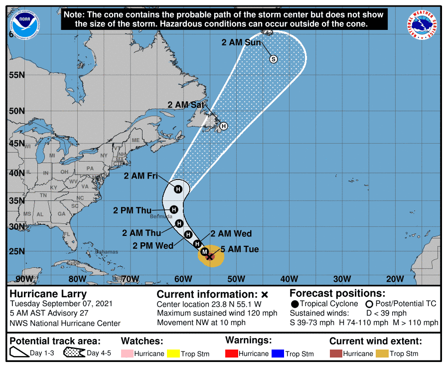 It was expected to bring high winds storm surge and heavy rain to. Hurricane Larry is spinning in the open Atlantic and forecasters say theres a high probability it will strengthen into a major hurricane with its top winds blowing at 111 mph or.